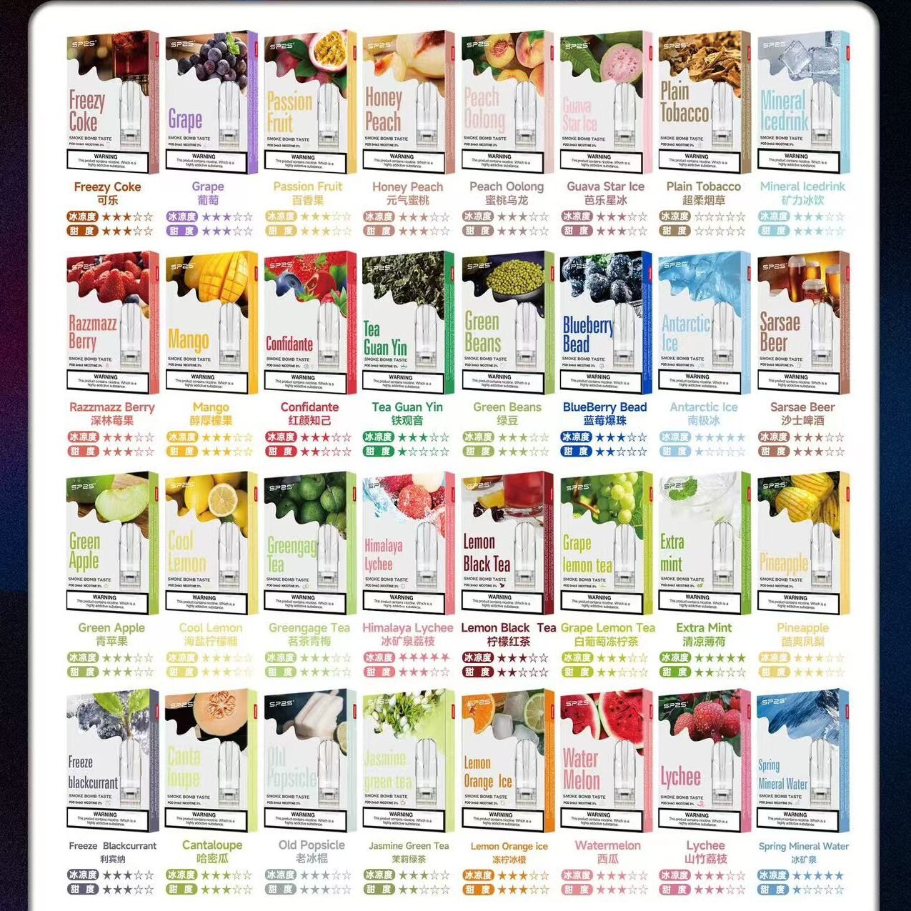 SP2S 提供多種經典與創新口味,滿足不同用戶的偏好。無論是冰爽、甜美、清新還是濃郁,都能找到你的心頭好。